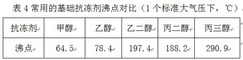 導(dǎo)熱介質(zhì)沸點(diǎn)的高低直接反映了整個(gè)換熱系統(tǒng)的耐高溫性能,這是保障整個(gè)系統(tǒng)安全運(yùn)轉(zhuǎn)的關(guān)鍵指標(biāo)。在此我們有必要對導(dǎo)熱介質(zhì)的沸點(diǎn)進(jìn)行一下剖析,決定產(chǎn)品沸點(diǎn)高低的是抗凍劑的沸點(diǎn)和助劑的添加情況,常用抗凍劑的沸點(diǎn)請參閱表4。