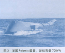 在葡萄牙海 域裝置了一套商業(yè)規(guī)模、按實際尺寸制造的海浪發(fā)電系統(tǒng)——Pelamis(借用希臘語中的“海蛇”)。整個系統(tǒng)是由鉸鏈組合在一起的三個鋼制大圓柱,用錨 在海底固定,它們半浮在海面上,并和海浪總的走向一致。圓柱的直徑3.5米,長度有120米,比標(biāo)準(zhǔn)足球場還長。設(shè)計發(fā)電能力是750千瓦。