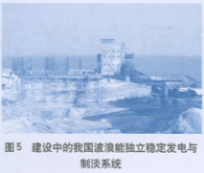 我國政府“十五”期間共投入經(jīng)費435萬,其中國家“十五”“863”計劃支持120萬,中國科學(xué)院知識創(chuàng)新工程支持300萬,廣東省科技計劃項目支持 15萬,由中國科學(xué)院廣州能源研究所研制一座波浪能獨立發(fā)電系統(tǒng)(圖5)。該系統(tǒng)由一個振蕩水柱裝置和一個振蕩浮子裝置俘獲波浪能,通過具有能量緩沖器的 液壓系統(tǒng),波浪能被轉(zhuǎn)換成穩(wěn)定的液壓能,用于發(fā)電、海水淡化和制冰。2004年9月在實驗室成功地將平均功率8kW、波動值為8kW的不穩(wěn)定的液壓能轉(zhuǎn)換 為穩(wěn)定的電能。2005年1月,成功地實現(xiàn)了把不穩(wěn)定的波浪能轉(zhuǎn)化為穩(wěn)定電能。預(yù)計振蕩浮子式波浪能裝置將于2005年12月完工,屆時,該系統(tǒng)將提供用 戶可直接使用的穩(wěn)定電力,多余能量將用于制淡和制冰。