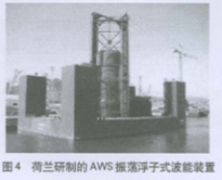 英國、美國、荷蘭、瑞典、丹麥、中國均開展了振蕩浮子式波浪能裝置的研究。其中,英國Wavebob公司研制的裝置有望在2005年實現(xiàn)小比例的實海況 實驗,2006年開始正式發(fā)電,預(yù)計把電送上岸的電價為3~5歐分(eurocents)/kWh。荷蘭的Teamwork Tech nology BV公司正在研制的AWS振蕩浮子式波能裝置(圖4)裝機容量為2MW。英國Cork大學(xué)和女王大學(xué)研究的McCabe Wave Pump(MWP)波力裝置可以為制淡提供能量,當(dāng)然也可用來發(fā)電。該裝置有望每年提供純凈水27.5萬立方米,運行成本為0.25美元/m3。美國的 Ocean Power Technolog(OPT)公司研制的PowerBuoy點吸收式波力裝置,單個裝置的裝機容量為20~50 kW ,多個裝置構(gòu)成的群可滿足兆瓦級用戶的需求,預(yù)計該裝置發(fā)電運轉(zhuǎn)成本對于100MW 規(guī)模的電站為3~4美分/kWh,1MW規(guī)模的電站為7~10美分/kWh。