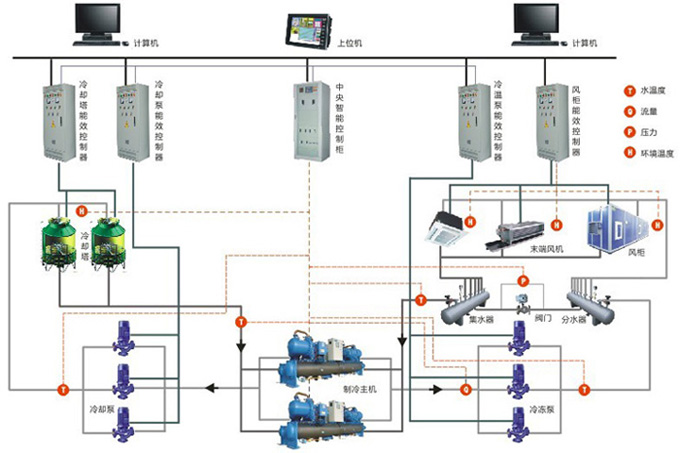 采用微電腦處理器和優(yōu)化專用程序,利用交流調(diào)速、多機(jī)并聯(lián)運(yùn) 行方式進(jìn)行閉環(huán)控制,按需要進(jìn)行軟件組態(tài),在線自動檢測制冷系統(tǒng)和熱負(fù)載的運(yùn)行狀況,根據(jù)溫度差值(流量、壓力)進(jìn)行PID調(diào)節(jié),使水泵電機(jī)輸出功率隨熱 負(fù)載的變化而變化,滿足冷氣需求量前提下達(dá)到最大限度的節(jié)能。