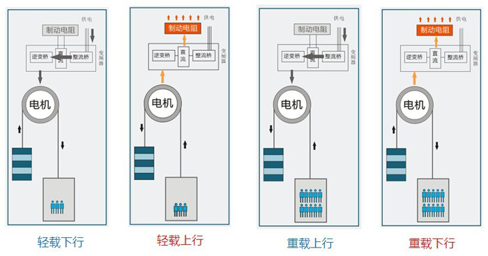 電梯是一個位能性負載,為了均勻拖動負荷,電梯負載由載客轎 廂和對重平衡塊組成。只有當轎廂載重量約為50%(如1噸載客電梯乘客為7人左右)時,轎廂和對重平衡塊才處于雙方質量基本平衡狀態(tài),否則,轎廂和對重平 衡塊就會有質量差,使電梯運行時產(chǎn)生機械位能(發(fā)電狀態(tài))。傳統(tǒng)的方式是采用采用制動單元和外加大功率電阻,將位能產(chǎn)生的電量以發(fā)熱方式消耗掉。