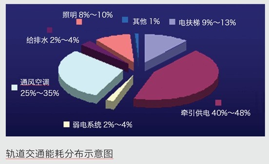 軌道交通系統(tǒng)是耗電量巨大、運(yùn)行成本很高的行業(yè),其用電量約2.4 kW•h/車公里,占運(yùn)營(yíng)總電耗約40%~48%。所以降低能耗、節(jié)約能源是軌道交通管理部門關(guān)注的重點(diǎn)。如何建設(shè)節(jié)能的軌道交通系統(tǒng)成為軌道交通系統(tǒng)規(guī) 劃設(shè)計(jì)與建設(shè)管理中的一個(gè)重要研究課題,也是行業(yè)發(fā)展的方向和追求的目標(biāo)。軌道交通能耗主要分布在牽引系統(tǒng)(列車牽引及照 明等)、機(jī)電設(shè)備(通風(fēng)空調(diào)、車站照明、扶梯設(shè)備、給 排水及消防等)、弱電系統(tǒng)(通信、信號(hào)及FAS、BAS及 AFC等)及其他方面。
