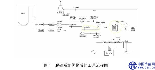 較小的開啟狀態(tài),給增壓風(fēng)機(jī)B一定的煙氣通流能力,防止腐蝕。這樣,旁路煙道中的煙氣和少量增壓風(fēng)機(jī)B通道中流通的煙氣匯合后進(jìn)入煙氣熱量回收器,冷卻、脫硫后經(jīng)煙囪排向大氣。系統(tǒng)工藝流程圖如下: