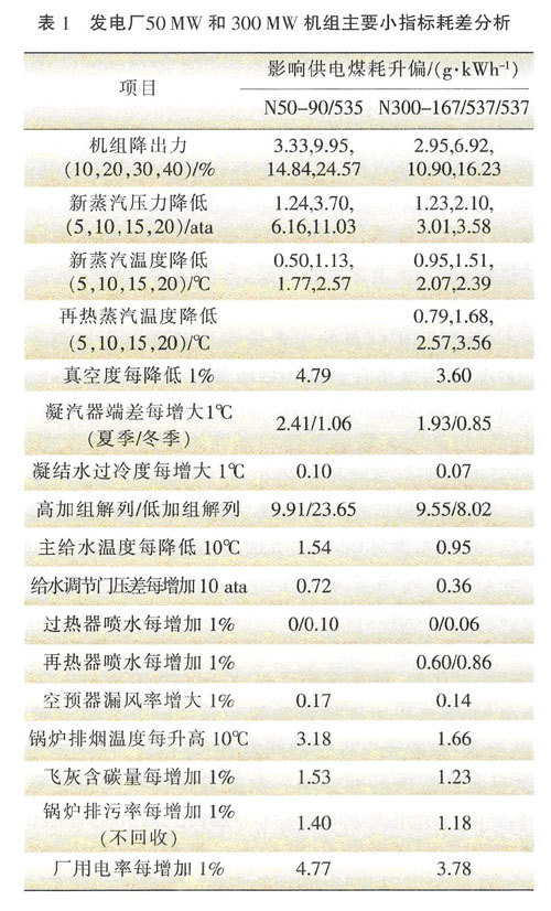 開(kāi)展運(yùn)行指標(biāo)競(jìng)賽是發(fā)電廠運(yùn)行工作中的基礎(chǔ)工作,指標(biāo)競(jìng)賽可以充分調(diào)動(dòng)運(yùn)行人員的工作積極性,指標(biāo)競(jìng)賽直接關(guān)系到機(jī)組經(jīng)濟(jì)效益。發(fā)電廠可根據(jù)自 己的實(shí)際情況制訂切實(shí)可行的機(jī)組小指標(biāo)競(jìng)賽管理辦法,做好運(yùn)行的基礎(chǔ)管理工作,表1提供了50MW和300MW機(jī)組的主要小指標(biāo)耗差分析,僅供參考。