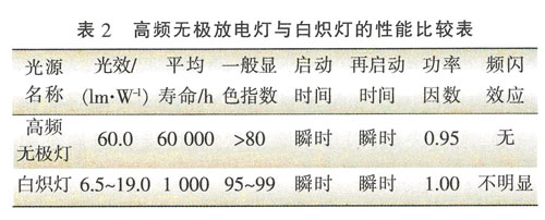 高頻無(wú)極放電燈,簡(jiǎn)稱無(wú)極燈,也叫電磁感應(yīng)燈。高頻無(wú)極燈以其高光效、高顯色性、長(zhǎng)壽命、無(wú)頻閃(工作頻率為2.65 MHz)、瞬時(shí)啟動(dòng)和再啟動(dòng)、耐震性好的優(yōu)良特性,現(xiàn)在較多地應(yīng)用在節(jié)能照明領(lǐng)域。表2是高頻無(wú)極放電燈與白熾燈的性能比較表,通過(guò)比較,可見(jiàn)高頻無(wú)極放 電燈的節(jié)能效果。