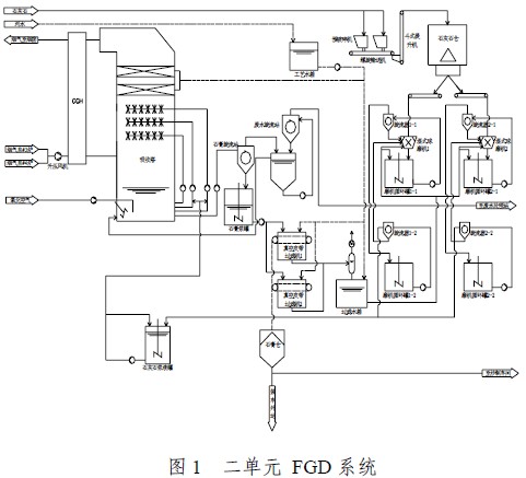 熱電分公司FGD系統(tǒng)如圖1所示。工藝系統(tǒng)主要包括:煙氣系統(tǒng)、SO2吸收系統(tǒng)、吸收劑制備系統(tǒng)、石膏脫水系統(tǒng)、工藝水系統(tǒng)、廢水處理系統(tǒng)、電氣及自動(dòng)控 制系統(tǒng)。主要設(shè)備包括:增壓風(fēng)機(jī)、煙氣擋板門(mén)、回轉(zhuǎn)式換熱器(GGH)、吸收塔、除霧器、噴淋管、氧化風(fēng)機(jī)、吸收塔循環(huán)泵、石灰石破碎機(jī)、濕式球磨機(jī)、石 灰石漿液旋流器、石膏漿液旋流器、真空皮帶脫水機(jī)、石膏炒制及制板設(shè)備等。