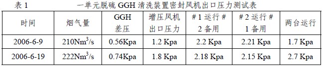 按廠家原設(shè)計(jì),每臺(tái)密封風(fēng)機(jī)只為一部GGH清洗裝置提供密封風(fēng),但通過(guò)對(duì)以往增壓風(fēng)機(jī)運(yùn)行數(shù)據(jù)分析,得出一臺(tái)風(fēng)機(jī)就可滿足兩部GGH清洗裝置的需要,所以 我們提出在兩臺(tái)密封風(fēng)機(jī)出口管之間加裝聯(lián)絡(luò)門(mén),采取一運(yùn)一備的運(yùn)行方式,這樣既可以保證設(shè)備安全運(yùn)行又方便檢修。這一建議在機(jī)組投運(yùn)后所作測(cè)試(見(jiàn)表1) 中得到論證。通過(guò)對(duì)三個(gè)月來(lái)的運(yùn)行情況檢測(cè),效果非常理想。