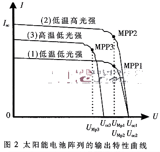 太陽(yáng)能賽車是利用太陽(yáng)能電池發(fā)電驅(qū)動(dòng)的電動(dòng)車。太陽(yáng)能電動(dòng)賽車的電器系統(tǒng)基本結(jié)構(gòu)如圖1所示。 MPPT(Maximum Power Point Tracker)即峰值功率跟蹤器,是太陽(yáng)能電池發(fā)電系統(tǒng)中的重要部件。眾所周知,在確定的外部條件下,隨著負(fù)載的變化,太陽(yáng)能電池陣列輸出功率也會(huì)變 化,但是存在一個(gè)最大功率點(diǎn)Pm以及與最大功率點(diǎn)相對(duì)應(yīng)的電壓UMp和電流IMD。當(dāng)工作環(huán)境變化時(shí),特別是日光照度和環(huán)境溫度變化時(shí),太陽(yáng)能電池陣列的 輸出特性曲線也隨之變化,與之相對(duì)應(yīng)的最大功率點(diǎn)也隨之改變,如圖2所示。通常來(lái)講,太陽(yáng)能電池輸出特性曲線的變化與日光照度的變化是成比例的。但在實(shí)際 應(yīng)用中,日光照度的變化再加上工作溫度的變化,使得太陽(yáng)能電池輸出特性的變化很復(fù)雜。