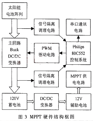 MPPT的硬件包括MPPT主回路、微處理器、信號(hào)調(diào)理電路、PWM驅(qū)動(dòng)電路、電源、通信接口等六個(gè)部分。其硬件結(jié)構(gòu)如圖3所示。 MPPT的電壓轉(zhuǎn)換器采用Buck DC/DC轉(zhuǎn)換器,以MOTOROLA場(chǎng)效應(yīng)管作為電子開(kāi)關(guān)器件;采用PWM控制方式,工作頻率為16kHz。由上述的太陽(yáng)能電池陣列電壓與蓄電池電壓可 知,MPPT的Buck DC/DC轉(zhuǎn)換器的降壓比在0.6~1.0之間。在這個(gè)降壓比范圍內(nèi),MPPT的轉(zhuǎn)換效率在86%~99%之間。 由于采用了Buck DC/DC轉(zhuǎn)換器,在太陽(yáng)能電池陣列的工作電壓高于蓄電池電壓的情況下,通過(guò)調(diào)整BuckDC/DC轉(zhuǎn)換器的占空比即可改變太陽(yáng)能電池陣列的工作電壓 [3]。MPPT的Buck DC/DC轉(zhuǎn)換器的電感上L=4mH,臨界負(fù)載電流Iok為: Iok=(Vout/2Lf)/(1-D) Iok|D=0.7=120V/(2%26;#215;4mH%26;#215;13kHz)(1-0.7)≈0.35A 當(dāng)電流I0.35A、占空比D0.7時(shí),