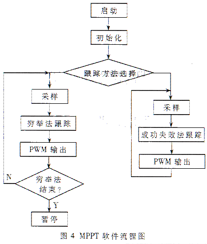 MPPT的軟件采用模塊化結(jié)構(gòu),包括初始化、采樣、窮舉法跟蹤、成功失敗法跟蹤、PWM輸出、串口通訊等模塊。系統(tǒng)程序流程圖如圖4所示。