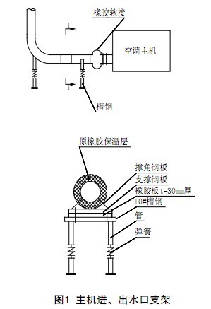 這樣可使冷水機(jī)組振動源在最近距離內(nèi)給予減弱,降低傳給冷凍主管的振動(主機(jī)進(jìn)、出水口支架示意見圖1)。如果減振軟接頭產(chǎn)品不能滿足設(shè)計(jì)要求可承受的 50噸壓力,則要將橡膠減振軟接頭改為裝在主管近空調(diào)主機(jī)第一個(gè)彎頭的上方,減振軟接頭豎直安裝(符合空調(diào)設(shè)計(jì)要求),彎頭至空調(diào)主機(jī)段主管安裝彈簧支承 托架。