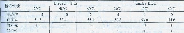 根據(jù)節(jié)能工藝的要 求,選擇的精練劑除了具有良好的去雜精練乳化功能之外,精練劑在不同溫度下的適應(yīng)性尤為重要,在所選擇試驗(yàn)的幾個(gè)精練劑中(如表2),綜合性能指 標(biāo),Diadavin HLS和Tanalev KDC比較理想,岡此以這兩個(gè)精練劑分別選擇20℃、40℃、60℃的精練溫度進(jìn)行試驗(yàn),見(jiàn)表3。