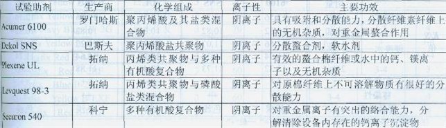 螯合劑:Acumer 6100(羅門哈斯)、Dekol SNS(巴斯夫)、Plexene UL、Levquest L-983(拓納)、Securon 540(科寧)。