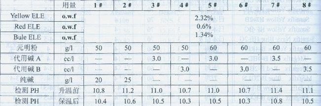 其次觀察兩種不同堿劑工藝的上染變化情況,實(shí)驗(yàn)得出,代用堿A、B的用量為碳酸鈉1/6和1/7左右時(shí),染色的上染率和碳酸鈉固色工藝結(jié)果稍微有變化, 特別在代用堿的用量為碳酸鈉用量比例在1/6時(shí)基本接近,但是從3≠f至6≠}結(jié)果中發(fā)現(xiàn),使用相同用鼉的代用堿劑時(shí),適當(dāng)增加元明粉的用最可以使上染率 得到改善。綜合各項(xiàng)染色性能來(lái)看:7#8#的代用堿固色工藝的效果良好。