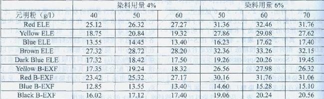 由表9中可以發(fā)現(xiàn),粘膠/棉混紡纖維在 活性染料染中深色的過(guò)程中,元明粉用量會(huì)影響兩種纖維的上染率,同時(shí)棉纖維部分的上染率要高于粘膠纖維部分,其中ELE型(85℃染料)和B型(60℃染 料)兩種活性染料,對(duì)元明粉用量大小的依存性比較小,上染率穩(wěn)定,當(dāng)染料用量4%左右時(shí),元明粉用量在50g/l左右;當(dāng)染料用量6%左右時(shí),元明粉用量 在60g/l左右。這樣有助于改善兩種纖維的同色性和上染深度。