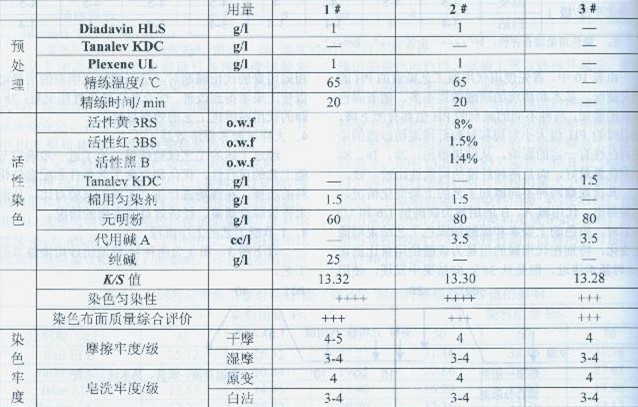 (1)通過(guò)試驗(yàn),選擇對(duì)精練劑、螯合分散劑、活性染色代用堿等節(jié)能工藝的配套助劑,進(jìn)行一系列的對(duì)比試驗(yàn),其中針對(duì)粘膠/棉混紡紗線的特點(diǎn),優(yōu)化后得出預(yù)精練+活性染色代用堿法工藝和練染同浴活性染色代用堿法工藝。