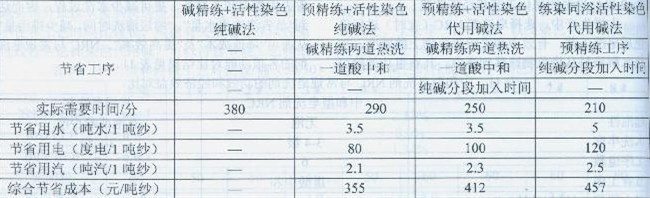 注:(1)經(jīng)濟(jì)效益的核算中,生產(chǎn)用水按每噸2元計(jì)算:生產(chǎn)用電按每度0.6元計(jì)算;生產(chǎn)用蒸汽按每噸150元計(jì)算。(2)綜合節(jié)省成本的按同“堿精練+活性染色純堿法”工藝為比較。(3)綜合節(jié)省成本中未包含排污成本和用工成本等費(fèi)用。