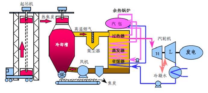 傳統(tǒng)的熄焦方法采用噴水降溫,紅焦顯熱浪費很大。干熄則吸收紅焦的80%左右的熱量使之產(chǎn)生蒸汽。
