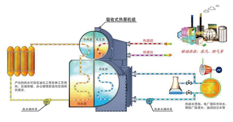 利用吸收式熱泵技術(shù)可以利用各種熱能,如以蒸汽、熱水和燃料燃燒產(chǎn)生的煙氣為驅(qū)動熱源;以各種低品位熱源,如余熱、排熱、太陽能、地下熱能、大氣和江河湖水等為低溫?zé)嵩础?/span>