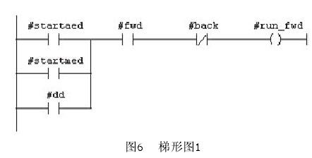 1)正轉使得梯形圖,由于正轉是可有三種控制方法,因此前端要并聯(lián)三個運行模式:自動,手動和點動。而變量則是前面端的中間變量,如圖6所示。