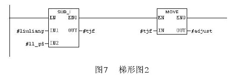 2)這是電動調(diào)節(jié)閥的梯形圖,由于原理是流量計采集來的參數(shù)與給定的參數(shù)比較,而產(chǎn)生的控制信號,因此用到減法器和MOVE器,如圖7所示。