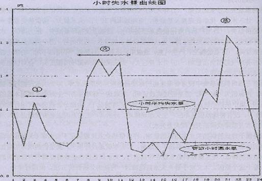 通過(guò)失水曲線圖可以看出,該熱力站的小時(shí)失水量均在0.96噸線以上,這部分水量屬于管道漏水量,包括熱力站內(nèi)閥門(mén)或其他設(shè)備的滴、漏及管線老 化漏點(diǎn)造成的失水。這種失水量的主要特征是全天每個(gè)時(shí)點(diǎn)的失水量變化幅度不大,曲線表現(xiàn)為一條直線;而對(duì)于用戶失水量則表現(xiàn)為在一天的不同時(shí)段出現(xiàn)明顯的 波峰、波谷,且峰谷差值較大,一般與人們?nèi)粘I钇鹁訒r(shí)間相吻合。如上圖①時(shí)段為凌晨2:00—4:00,表為典型的營(yíng)業(yè)性失水特征,浴池注水、食品加工 等;②時(shí)段為上午7:00—ll:00,洗漱、餐飲用水,造成熱力站水量出現(xiàn)高峰;③時(shí)段為晚上20:00—22:00,用戶洗浴、洗衣服、搞衛(wèi)生等,亦 使熱力站水量出現(xiàn)高峰。