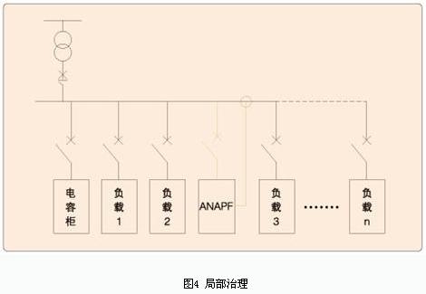 ?。?)局部治理適用于諧波源集中在某一條或幾條饋出支路的配電系統(tǒng),比如醫(yī)院的精密儀器、UPS電源等,雖然單臺設備的電流小,諧波含量低,但為防止其他設備產生的諧波對其干擾,采用局部諧波補償,如圖4所示: