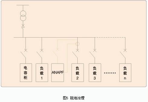 ?。?)就地治理適用于諧波源比較明確且單臺設備諧波含量較大的配電系統(tǒng),比如大型商業(yè)區(qū)的景觀照明、影劇院的可控硅調光設備、工業(yè)區(qū)的變頻器調速設備等,單臺設備電流大、諧波含量高、諧波電流大,為防止諧波電流影響其他用電設備,采用就地治理,如圖5所示: