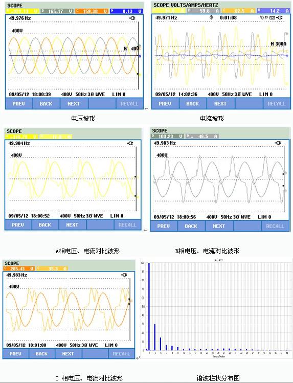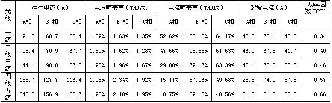 具體測量情況如下:測量點1 :北燈光站進線乙的變壓器低壓側,電容柜投切前后,實時測量 1 級光至 5 級光時的情況;測量點2 :滑行道中線燈回路 3 調光器進線側,實時測量 1 級光至5 級光的情況;測量點3 :北燈光站進線甲的變壓器低壓側,電容柜投切前后,實時測量 1 級光至 5 級光的情況;測量點4 :跑道邊燈回路2 調光器的進線側,實時測量 1 級光至 5 級光的情況;1)主要諧波源——調光器(以測量點1為例)