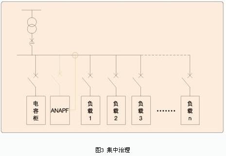 ?。?)集中治理適用于單臺設備諧波含量小,但數(shù)量龐大、布局分散的場合,比如辦公大樓(個人電腦、節(jié)能燈、變頻空調、電梯等),雖然單臺設備的電流小,諧波含量低,但整棟大樓的電流大,諧波電流也大,如圖3所示: