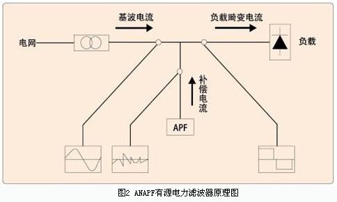3.2諧波治理方案安科瑞ANAPF系列有源電力濾波器,以并聯(lián)方式接入電網(wǎng),通過實時檢測負載的諧波和無功分量,采用PWM變流技術,從變流器中產生一個和當前諧波分量和無功分量對應的反向分量并實時注入電力系統(tǒng),從而實現(xiàn)諧波治理和無功補償,如圖2所示:
