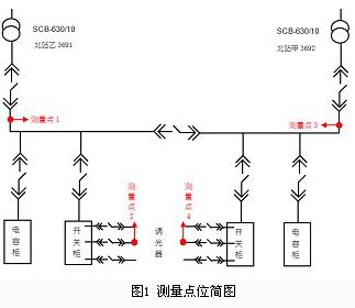 在進行諧波治理之前,必須要了解電網(wǎng)中諧波的次數(shù)及其含量,即必須進行諧波的測試。諧波測量是諧波問題的一個重要環(huán)節(jié),它也是諧波問題研究的主要依據(jù)。我們在上海虹橋機場東跑道北燈光站進行了諧波檢測。針對北燈光站兩臺變壓器的低壓進線側、跑道邊燈回路2、滑行道中線燈回路3的調光器進線側進行了電能質量等各項數(shù)據(jù)的測量和采集。(測量點位見圖1)