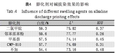 為 提高汽蒸時(shí)堿的滲透和增強(qiáng)纖維的溶脹,選擇耐堿性的滲透劑和滌綸膨化劑為堿性拔染的助拔劑,考察對(duì)堿拔染效果的影響。當(dāng)氫氧化鈉質(zhì)量分?jǐn)?shù)為10%、汽蒸溫 度120℃、汽蒸時(shí)間25 min時(shí),3種3%的耐堿性滲透劑和4種0.33%的膨化劑對(duì)堿拔染效果的影響見(jiàn)表3和表4。