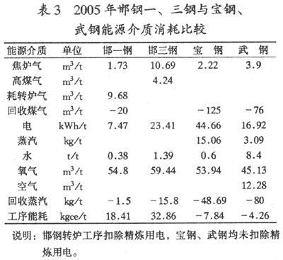 表3為2005年邯鋼一、三鋼與寶鋼、武鋼能源介質(zhì)消耗比較。從表3可以看出,邯鋼轉(zhuǎn)爐與寶鋼、武鋼有較大的差距。