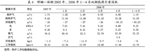 表2為邯鋼一、三鋼2006年1~4月份轉(zhuǎn)爐工序能耗完成情況。