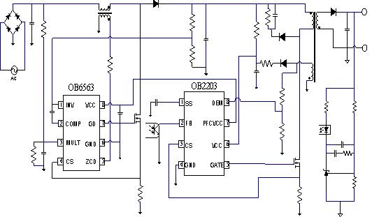 昂 寶120W PFC+QR解決方案采用OB6563和OB2203芯片。其中OB6563是高性能的臨界模式(Transition mode)功率因子校正器(PFC),這款產(chǎn)品對傳統(tǒng)的臨界模式控制進(jìn)行了優(yōu)化設(shè)計(jì),使系統(tǒng)易于實(shí)現(xiàn)接近于1的功率因子;同時集成了多項(xiàng)昂寶的專利技術(shù), 提升了客戶的應(yīng)用價值,分別實(shí)現(xiàn)了:
