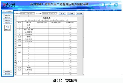 5.2.3報表統(tǒng)計用電量報表功能,可選擇時間段進行查詢,支持任意時間段電度累計查詢,具備數(shù)據(jù)導出和報表打印等功能。為值班人員提供了精確可靠的電能報表。該報表各回路名稱和數(shù)據(jù)庫關(guān)聯(lián),方便用戶修改回路名稱。