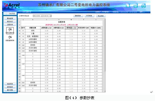 5.2.2參數(shù)抄表參數(shù)抄表功能,主要完成對低壓各出線回路的電參數(shù)進線查詢。支持任意時刻電參數(shù)查詢,具備數(shù)據(jù)導出和報表打印等功能。該報表查詢供變電所2臺變壓器出線各低壓回路的電參數(shù),主要包括:三相電流、有功功率和有功電度。該報表各回路名稱和數(shù)據(jù)庫關(guān)聯(lián),方便用戶修改回路名稱。