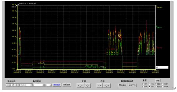 3)趨勢曲線分析Acrel-3000電能管理系統(tǒng)提供了實時曲線和歷史趨勢兩種曲線的分析界面,通過調用相關回路實時曲線界面分析該回路當前的負荷運行狀況。如通過調用某配出回路的實時曲線可分析該回路的電氣設備所引起的信號波動情況。系統(tǒng)的歷史趨勢即系統(tǒng)對所有已存儲數(shù)據(jù)均可查看其歷史趨勢,方便工程人員對監(jiān)測的配電網(wǎng)絡進行質量分析。