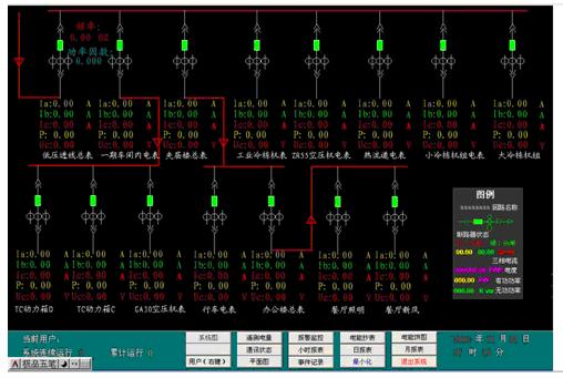 1)系統(tǒng)主界面系統(tǒng)提供簡單、易用、良好的用戶使用界面。采用全中文界面,CAD圖形顯示配電系統(tǒng)電氣一次主接線圖,顯示配電系統(tǒng)設備狀態(tài)及相應實時運行參數(shù),畫面定時輪巡切換;畫面實時動態(tài)刷新;模擬量顯示;開關量顯示;連續(xù)記錄顯示等,通過畫面顏色的變化(紅色表示合閘狀態(tài)、綠色表示分閘狀態(tài))可以看到各回路的分合閘狀態(tài)。