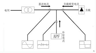 ANAPF有源濾波裝置的原理:以并聯(lián)方式接入電網(wǎng),通過實時監(jiān)測負(fù)載的諧波和無功分量,采用PWM變流技術(shù),從變流器中產(chǎn)生一個和當(dāng)前諧波分量和無功分量對應(yīng)的反向分量并實時注入電力系統(tǒng),從而實現(xiàn)諧波治理和無功補償。