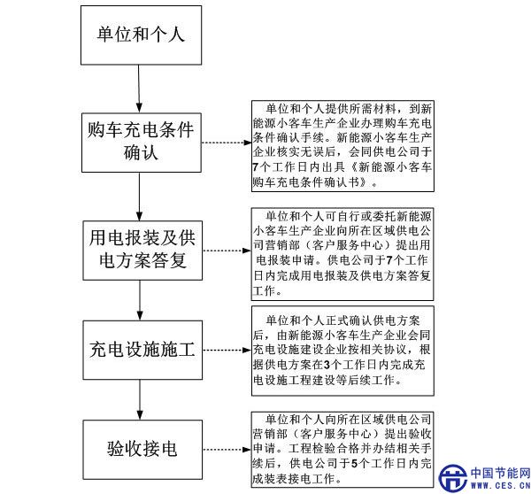 (二)受理用戶申請(qǐng)后,新能源小客車生產(chǎn)企業(yè)對(duì)用戶資料的真實(shí)性和完整性核實(shí)無誤后,會(huì)同供電公司按照約定勘查時(shí)間到現(xiàn)場(chǎng)進(jìn)行用電、施工可行性勘查。供電公司負(fù)責(zé)對(duì)用戶電源條件進(jìn)行確認(rèn),完成《自用充電設(shè)施用電初步可行性方案》編制。新能源小客車生產(chǎn)企業(yè)負(fù)責(zé)對(duì)充電設(shè)施建設(shè)的施工可行性進(jìn)行確認(rèn),會(huì)同供電公司于7個(gè)工作日內(nèi)出具《新能源小客車購車充電條件確認(rèn)書》。