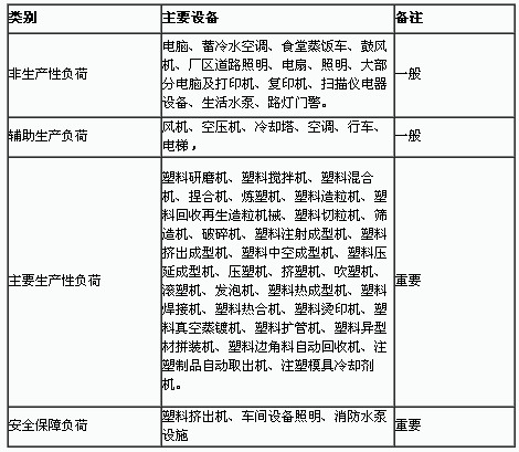 2. 塑料行業(yè)生產(chǎn)輔助設(shè)備負(fù)荷占生產(chǎn)負(fù)荷比率小,約為20%,且不能長(zhǎng)時(shí)間關(guān)停,否則原料補(bǔ)充不到位最終導(dǎo)致全部生產(chǎn)線停產(chǎn)。