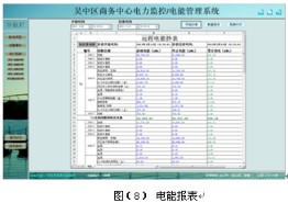 用電量報(bào)表功能,可選擇時(shí)間段進(jìn)行查詢(xún),支持任意時(shí)間段電度累計(jì)查詢(xún),具備數(shù)據(jù)導(dǎo)出和報(bào)表打印等功能。為值班人員提供了精確可靠的電能報(bào)表。該報(bào)表各回路名稱(chēng)和數(shù)據(jù)庫(kù)關(guān)聯(lián),方便用戶(hù)修改回路名稱(chēng)。如下圖所示,顯示健身中心某段時(shí)間內(nèi)的各配電回路的精確用電量,用戶(hù)可以直接打印報(bào)表,可以以EXCEL格式另存到其他位置。 見(jiàn)圖(8)。