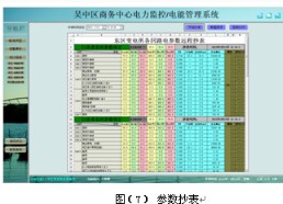 參數(shù)抄表功能,主要對(duì)低壓各出線回路的電參數(shù)進(jìn)線查詢(xún)。支持任意時(shí)刻電參數(shù)查詢(xún),具備數(shù)據(jù)導(dǎo)出和報(bào)表打印等功能。該報(bào)表查詢(xún)供兩個(gè)變電所8臺(tái)變壓器出線各低壓回路的電參數(shù),主要包括:三相電流、有功功率和有功電度及變壓器溫度。該報(bào)表各回路名稱(chēng)和數(shù)據(jù)庫(kù)關(guān)聯(lián),方便用戶(hù)修改回路名稱(chēng)。見(jiàn)圖(7)