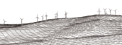 在許多國家陸上風電場所造成的視覺影響是一個很重要的議題,尤其是在那些人口密集度很高的地區(qū)。使用計算設計軟件可以計算出相關的視覺影響區(qū)域(ZVI) 或者是視覺足跡(visibility footprint)。通常來講,如果從所處位置可以看到風機的半個輪轂或整個輪轂或單個葉片尖的話,還不足以稱該風電場已經(jīng)產(chǎn)生了視覺影響。在風電場布 局的過程中,一般會采用單面線框模式繪制地形圖,用以凸顯指定角度所看到的風電場的視覺效果,如下圖所示。該效果圖也可以進一步以蒙太奇照片的形式展現(xiàn), 蒙太奇照片中從指定角度所看到的風電機組被有層理地排列。