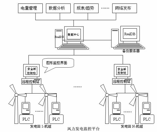 發(fā)電田中的所有的渦輪發(fā)電機組都連接在同一個局域網(wǎng)中,各個發(fā)電機組頂端的控制箱均使用以太網(wǎng)和塔底部的光纖網(wǎng)絡(luò)連接。該環(huán)網(wǎng)與遠(yuǎn)程控制站相 連形成一個冗余環(huán)網(wǎng)。遠(yuǎn)程控制站采用紫金橋前置數(shù)據(jù)采集軟件RealScada實現(xiàn)數(shù)據(jù)采集和監(jiān)控,并分析搜集到的數(shù)據(jù),從而調(diào)整發(fā)電機組參數(shù),并向操作 人員和維護人員提供報警信息。同時負(fù)責(zé)將搜集到的數(shù)據(jù)向上傳輸?shù)綌?shù)據(jù)中心服務(wù)器,實現(xiàn)對全局?jǐn)?shù)據(jù)的管理和上層應(yīng)用。
