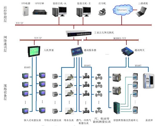 站控管理層針對(duì)能耗監(jiān)測(cè)系統(tǒng)的管理人員,是人機(jī)交互的直接窗口,也是系統(tǒng)的最上層部分。主要由系統(tǒng)軟件和必要的硬件設(shè)備,如工業(yè)級(jí)計(jì)算機(jī)、打印機(jī)、 UPS 電源等組成。監(jiān)測(cè)系統(tǒng)軟件具有良好的人機(jī)交互界面,對(duì)采集的現(xiàn)場(chǎng)各類數(shù)據(jù)信息計(jì)算、分析與處理,并以圖形、數(shù)顯、聲音等方式反映現(xiàn)場(chǎng)的運(yùn)行狀況。