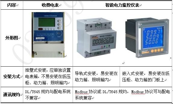 大型公共建筑電能計(jì)量宜采用電力儀表作為內(nèi)部管理電表,不宜用收費(fèi)電表。兩者主要特點(diǎn)歸納如下(見表1)。